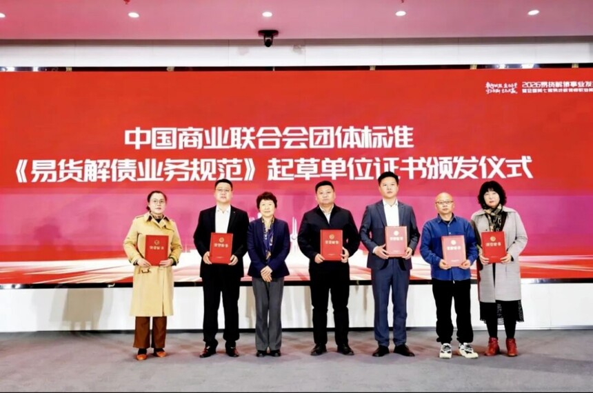 会上,举行了《易货解债业务规范》团体标准起草单位证书颁发仪式,中国商业联合会领导为湖南金泰数据科技有限公司等单位代表颁发证书。该标准于2025年11月1日正式实施,是我国易货解债领域首个团体标准,为易货解债业务开展提供了合规指引和操作规范。